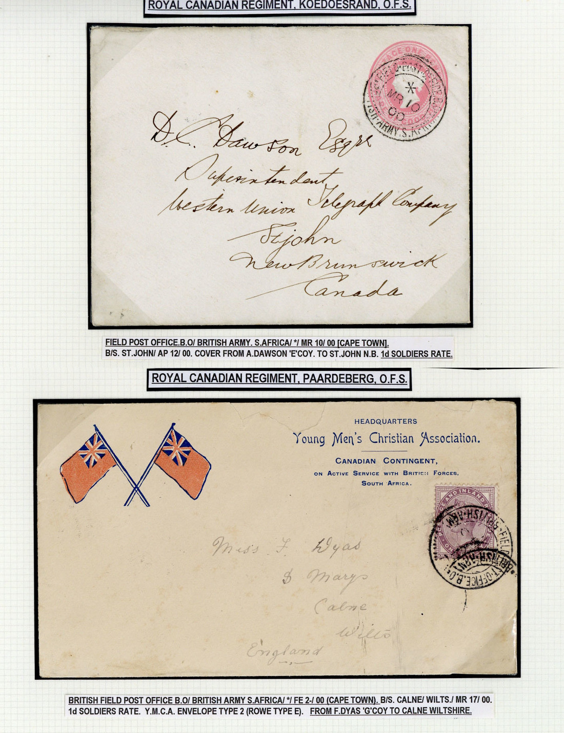 1900 (2 Feb.) Y.M.C.A. "crossed flags" envelope (Type E) from F. Dyas of "G" Company at Paardeberg to England, bearing 1d.with two indistinct F.P.O. c.d.s., and (10 Mar.) 1d. pink envelope from A. Dawson of "E" Company at Kodoes Rand to St. John cancelled by superb F.P.O. c.d.s.