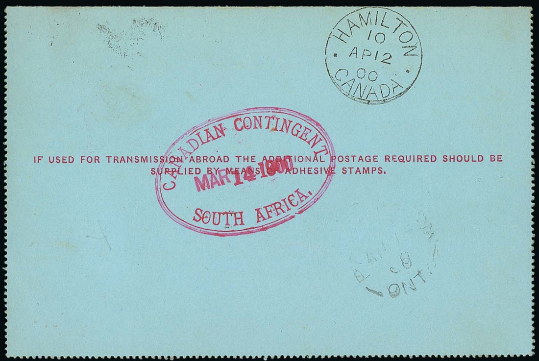 1900 (5 Mar.) 1d. letter card from Kimberley to Palmerston with superb strike of the oval-framed "canadian contingent/south africa." oval datestamp in red for 14 march on reverse, the second day of use of this handstamp; interesting contents re visiting post offices and sight of Cronje. Photo