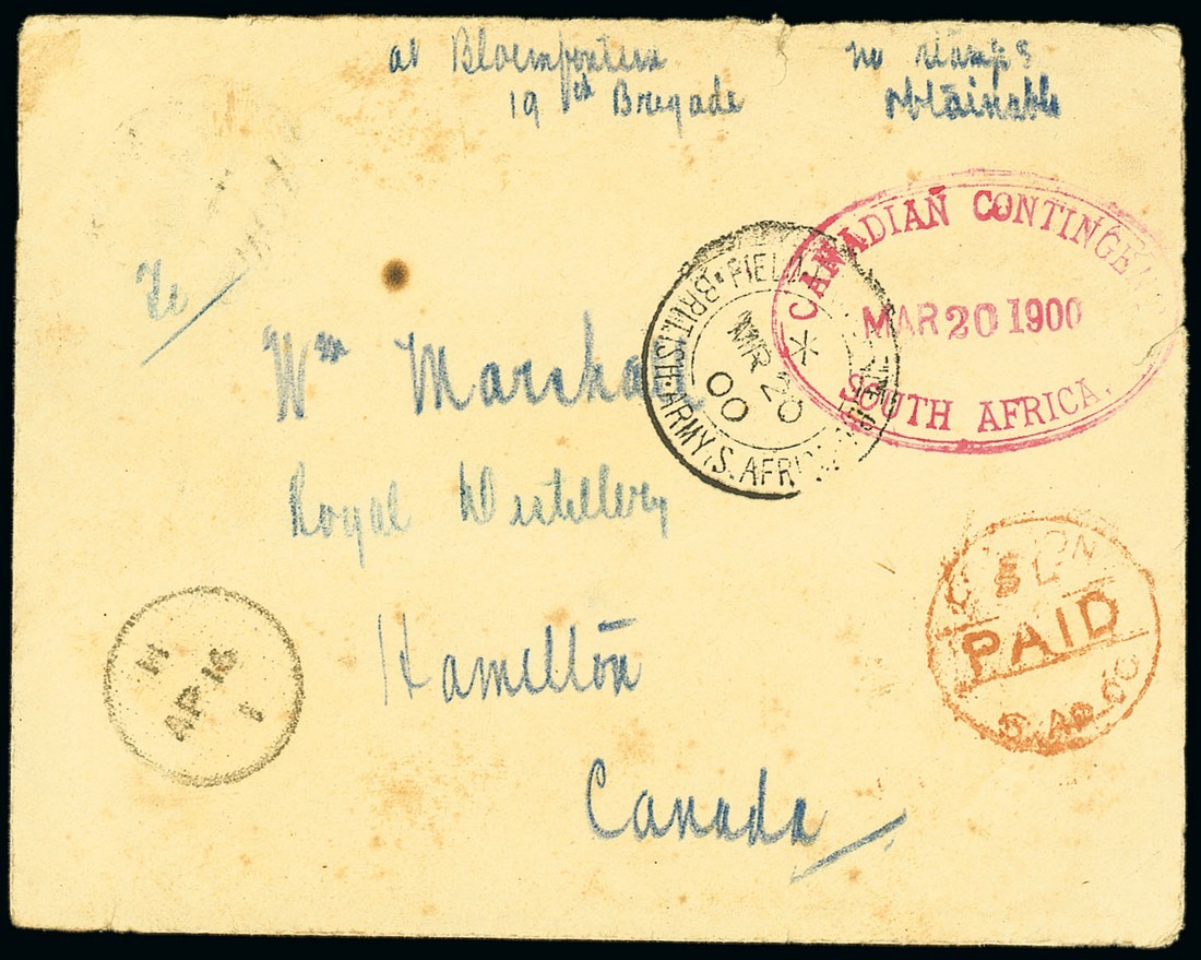 1900 (20 Mar.) unstamped envelope from Lt. W.R. Marshall of "C" Company to Hamilton, marked "at Bloemfontein 19th. Brigade no stamps obtainable" and showing F.P.O. c.d.s. and oval-framed "canadian contingent/south africa" datestamp in red, London Paid (6.4) and arrival (16.4) c.d.s., all on face, Hamilton c.d.s. (16.4) on reverse, and 1900 (12 Apr.) G.B. 1d. letter card from G.R. Eakins of "C" Company at Bloemfontein to Toronto, cancelled by light F.P.O. c.d.s. and with fine oval-framed "canadian contingent/south africa" datestamp (18.4) in red; contents include "they say that the ship with our last mail went down", a reference to the sinking of the S.S. Mexican