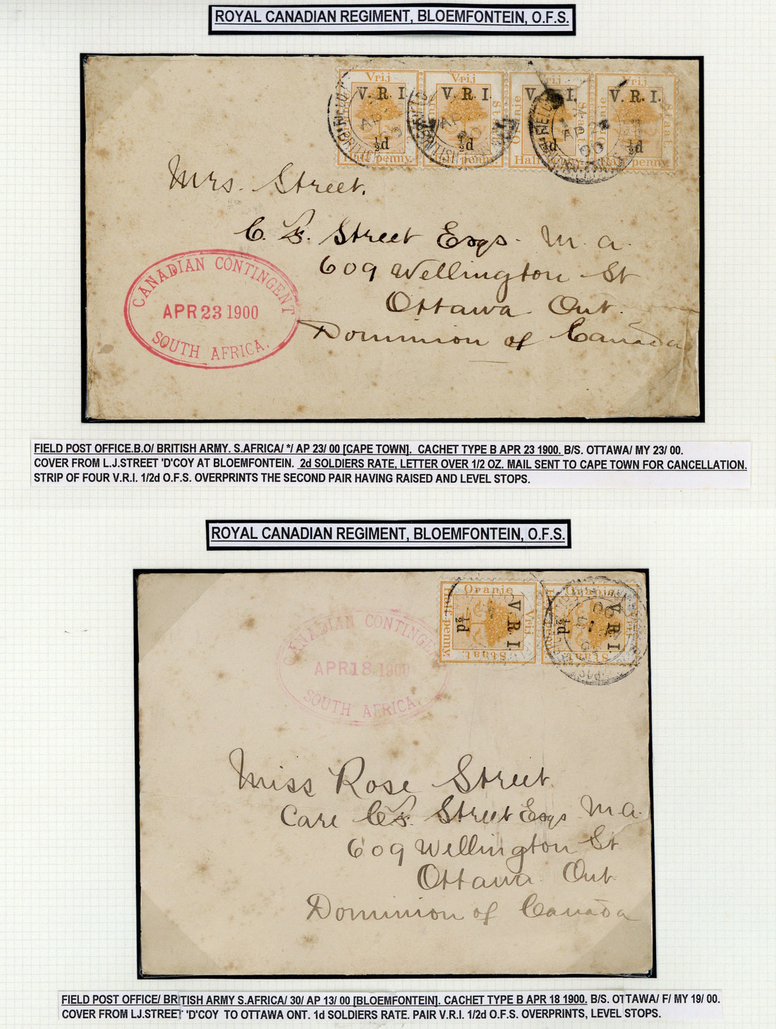 1900 (Apr.) envelopes (2, a few stains) ex the Street" correspondence from Bloemfontein to Ottawa, the first (18.4) bearing O.F.S. ½d. (2) with F.P.O. 30 c.d.s., the second (23.4) bearing O.F.S. ½d. (4) with F.P.O. c.d.s. and both showing oval-framed "canadian contingent/south africa." datestamp in red, the first a light strike