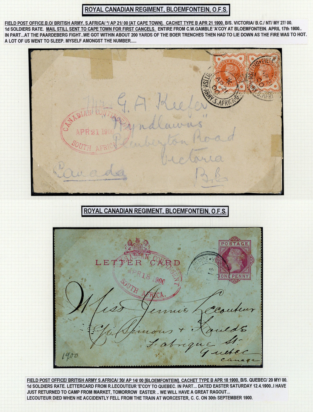 1900 (18 Apr.) 1d. letter card from R. Lecouteur of "E" Company to Quebec and (21 Apr.) envelope from C.W. Gamble of "A" Company to Victoria bearing ½d. pair, both from Bloemfontein cancelled by F.P.O. c.d.s. and showing oval-framed "canadian contingent/south africa." datestamp in red, the first (stains) includes "Lecouteur died when he accidently fell from a train at Worcester, C.C.", the second (sellotape repairs) with long letter which includes "At Paardeberg we got within about 200 yards of the Boer trenches then had to lie down as the fire was too hot"