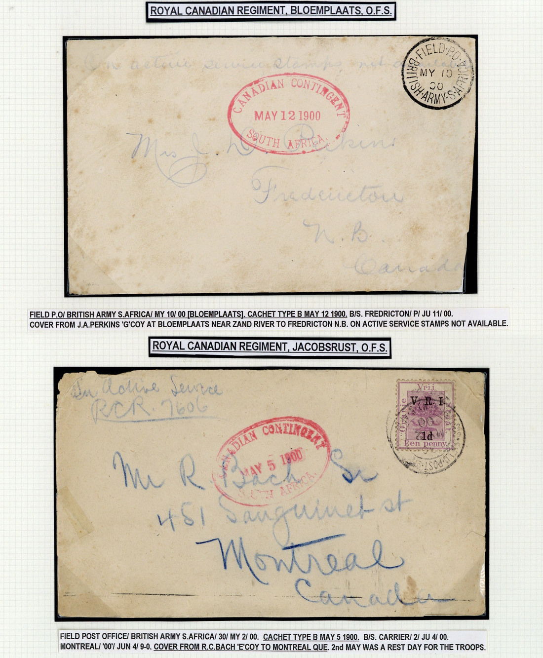 1900 (May) envelopes (3, a few faults), the first from R.C. Bach of "E" Company at Jacobsrust bearing O.F.S. 1d., the second a 1d. stationery envelope from W.J. Hart of "H" Company at Winburg to Halifax, the third unstamped from Bloemplaats to Fredericton, all three with F.P.O. c.d.s. and showing oval-framed "canadian contingent/south africa." datestamp in red for 5th., 9th. and 12th. respectively