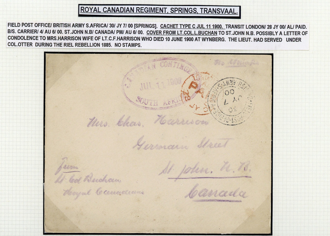 1900 (11 July) unstamped envelope from Lt. Col. L. Buchan at Springs to Mrs. C. Harrison at St. John (possibly a letter of condolence to the wife of Lt. C.F. Harrison who died at Winburg on 10 June), showing F.P.O. 30 c.d.s., London Paid c.d.s. (28.7) and generally fine oval-framed "canadian contingent/south africa." datestamp in violet
