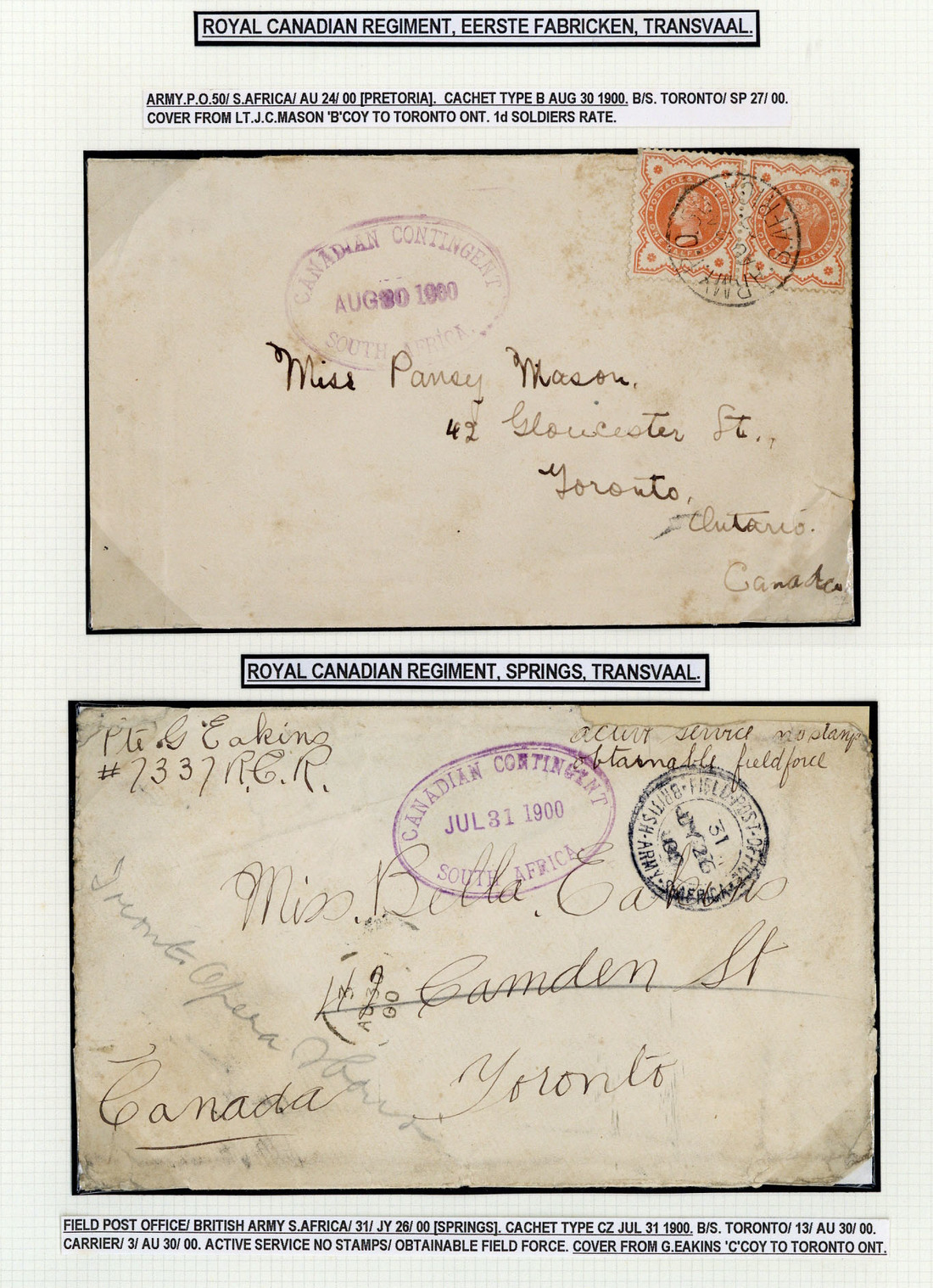 1900 (31 July) unstamped envelope from G. Eakins of "C" Company at Springs to Toronto and redirected locally, showing F.P.O. 31 c.d.s. and fine oval-framed "canadian contingent/south africa." datestamp in violet, and (30 Aug.) envelope from Lt. J.C. Mason of "B" Company at Eerste Fabricken to Toronto, bearing ½d. pair with A.P.O. 50 c.d.s. and showing largely fine oval-framed "canadian contingent/south africa." datestamp in violet; both with small faults though not unattractive