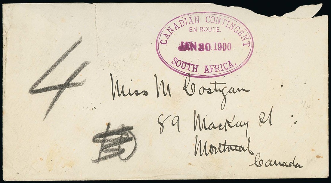 1900 (30 Jan.) envelope (Allan Line crest on flap) from Capt. R. Costigan of "E" Battery to Montreal, showing a superb strike of the oval-framed "canadian contingent/en route./south africa." datestamp in lilac, manuscript "10" due (deleted) replaced with "4", part arrival c.d.s. on reverse; part of flap and upper right corner torn away on opening though an attractive example of this rare handstamp on the first recorded date of use. Photo