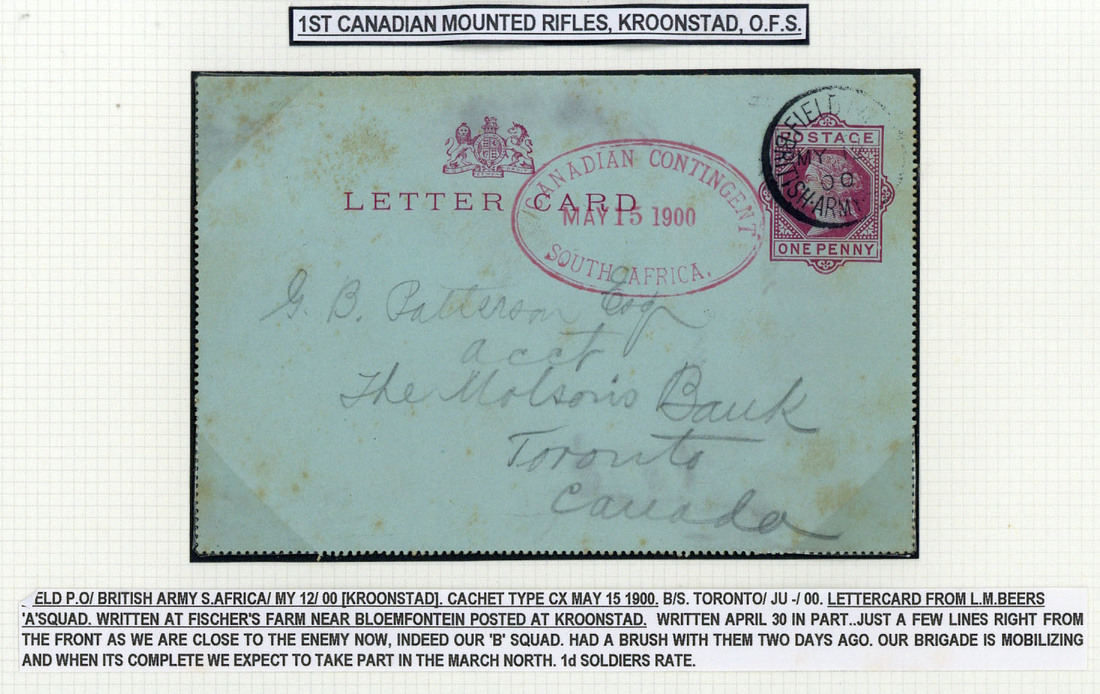 1900 (12 May) 1d. letter card (minor soiling) from L.M. Beers of "A" Squadron at Fischer's Farm near Bloemfontein and posted at Kroonstad to Toronto, cancelled by F.P.O. c.d.s. and showing fine strike of the oval-framed "canadian contingent/south africa." datestamp (15.5) in red alongside; interesting contents including "we are close to the enemy now. Indeed our "B" Squad. had a brush with them two days ago"
