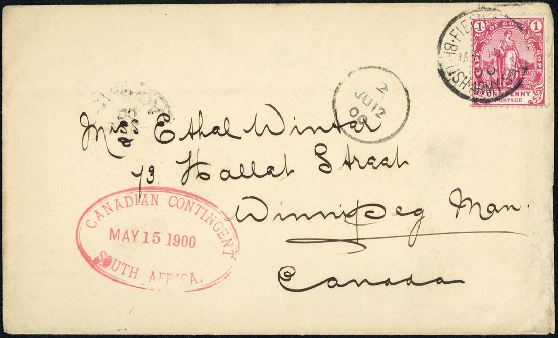 1900 (15 May) envelope from Sgt. W. Rhoades, 1st. Batt. at Kroonstad Field to Winnipeg, bearing 1d. cancelled by F.P.O. c.d.s. and showing a fine and local delivery datestamp (12.6)