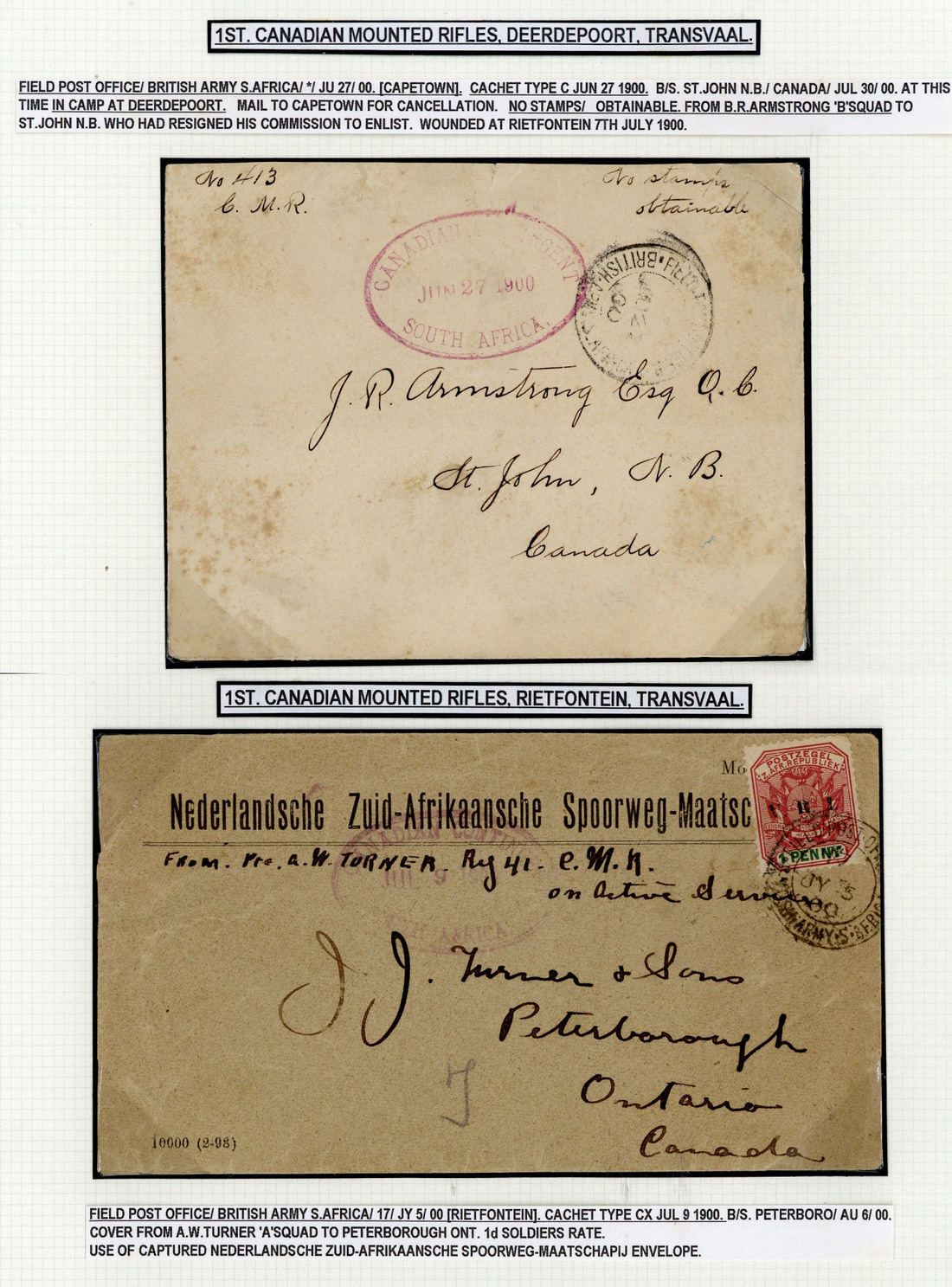 1900 (June) unstamped envelope from B.R. Armstrong of "B" Squadron at Deerdepoort to St. John, showing F.P.O. c.d.s. alongside oval-framed "canadian contingent/south africa." datestamp in magenta, and (5 July) captured "Spoorweg" stationery envelope from A.W. Turner of "A" Squadron at Rietfontein to Peterborough, Ontario, bearing 1d. with F.P.O. c.d.s. and with a light strike of the oval-framed "canadian contingent/south africa." datestamp (9.7) in magenta