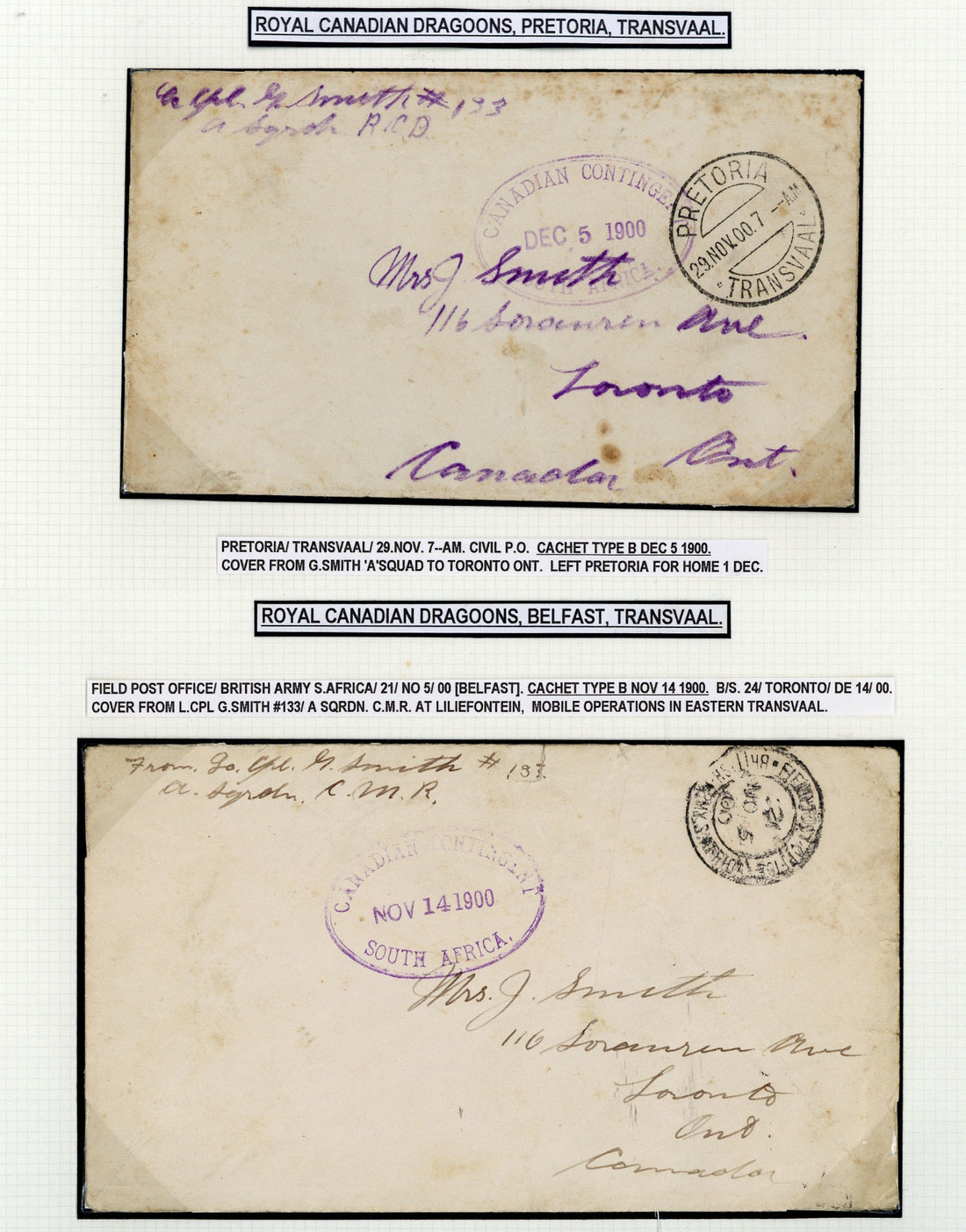 1900 (Nov. and Dec.) unstamped envelopes (imperfections) ex the Street correspondence to Toronto, the first from Liliefontein with F.P.O. 21 c.d.s., the second from Pretoria just before the squadron left for home, both showing oval-framed "canadian contingent/south africa." datestamp in magenta