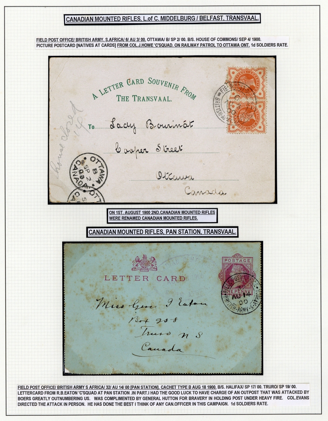 A selection (6) including 1d. letter cards (2), one from Victoria West Road to a member of the 2nd. Norfolk Regt. and twice redirected, and one from De Aar to Canada, and four with A.P.O. or F.P.O. c.d.s., three of which show faints strikes of the oval-framed "canadian contingent/south africa." datestamp; faults in places though an interesting group
