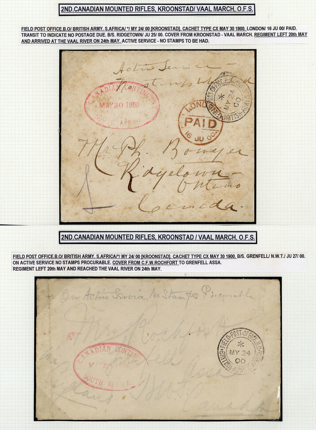 1900 (May) unstamped envelope from C.F.W. Rochfort at Kroonstad showing a good strike of the oval-framed "canadian contingent/south africa." datestamp in red, and 1900 (Oct.) unstamped envelope from Wonderfontein showing superb A.P.O. 55 c.d.s. and light strike of the oval-framed "canadian contingent/south africa." datestamp in violet, and 1900 (24 May) pair of unstamped envelopes (stains in places) from Kroonstadt, Transvaal, both with F.P.O. c.d.s. and oval-framed "canadian contingent/south africa" datestamp (30.5) in red with one also showing London Paid c.d.s.