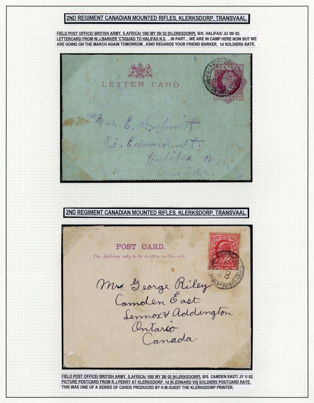 1902 covers (3, small faults) from members of the 2nd. Regiment, Canadian Mounted Rifles, comprising Y.M.C.A. illustrated envelope (a type not listed in Rowe) from Durban via London to Montreal, and 1d. letter card and postcard bearing 1d., both from F.P.O. 100 (Klerksdorp),