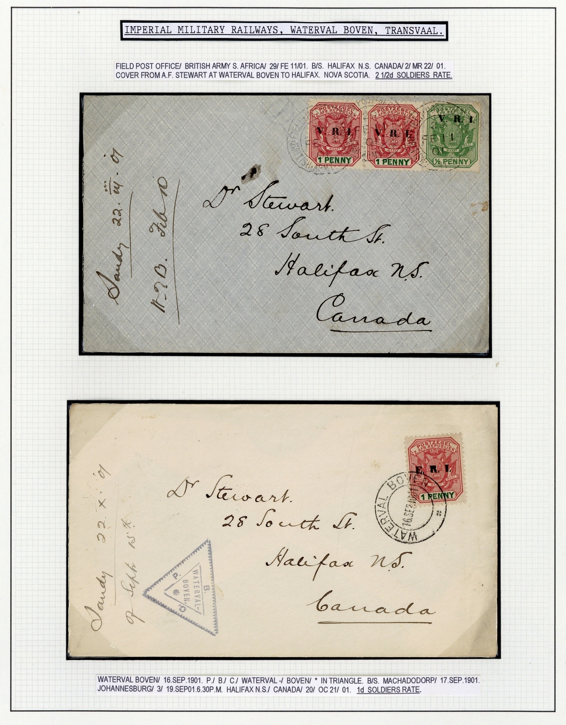 1900-01 envelopes (3) ex the Dr. Stewart correspondence to Halifax, one from Waterval Boven at 1d. soldier's rate, the other two from A.P.O. or F.P.O. and franked at 2½d., 1900 OHMS Imperial Military Railways printed envelope from F.P.O. 17 to Sherbrooke franked at 1d., and 1902 envelopes, one from G.V. Tierney from Waterval Boven to USA bearing 2½d., the other from Canada to A.E. Hillyard, both with censor cachets; also OHMS envelope with Director of Railways imprint