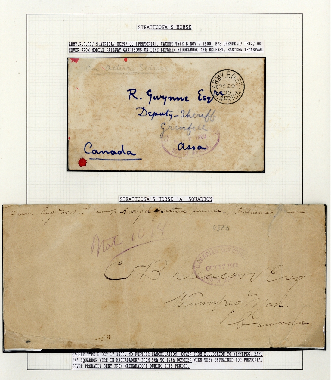 1900 (Oct.) unstamped envelopes (2), one (large) from B.L. Deacon of "A" Squadron at Machadadorp to Winnipeg, the second from A.P.O. 53 (29.10) and both showing light strikes of the oval-framed "canadian contingent/south africa." datestamp in violet; also (Aug.) large piece from Cpl. Townshend of "B" Squadron showing "army post office/3MB/south africa" c.d.s. (Witbank) and fine strike of the oval-framed "canadian contingent/south africa." datestamp; some soiling though not unattractive, and 1900 (15 Dec.) envelope registered to Regina, bearing G.B. 1d. (2) and 2½d. twice cancelled by F.P.O. 52 c.d.s. and with London Registered oval datestamps (12.1) below, Winnipeg (22.1) and Regina (24.1) on reverse; the earliest recorded date for this F.P.O. datestamp recorded by Rich
