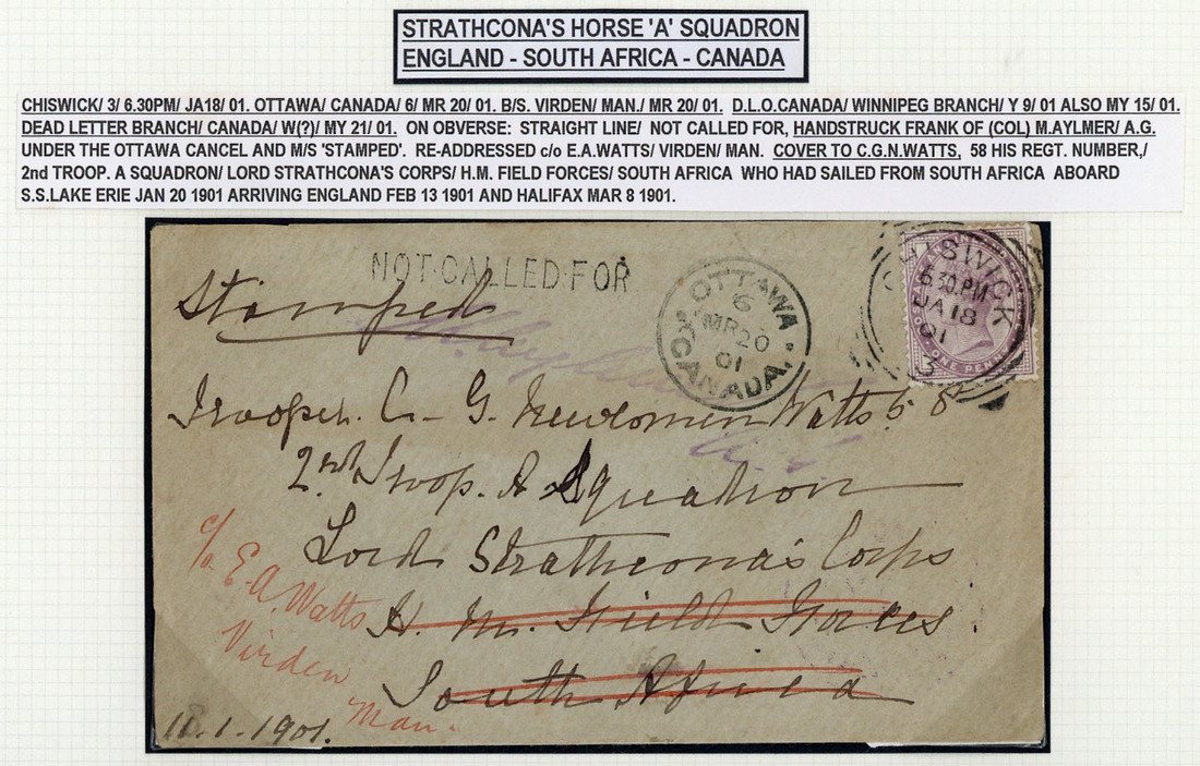 1901 (Jan.) envelope from London to Trooper C.G.N. Watts of 2nd. Troop. A Squadron and redirected to Virden, Man., showing "not called for" handstamp alongside Ottawa c.d.s. (20.3), the reverse with Virden (24.3), Winnipeg D.L.O. (9.5 and 15.5) and D.L.B. (21.5) c.d.s.