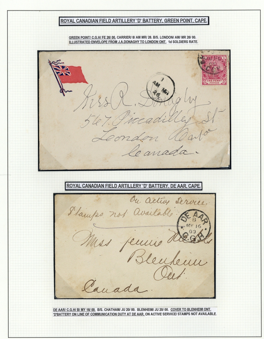 1900 envelopes (5) from members of "D" Battery at Green Point (illustrated type with flag in upper left corner), De Aar, Belmont and Orange River (1d. letter card), and large OHMS blue envelope from Lt. E.W.B. Morrison, Commander of "D" Battery, bearing Transvaal uncancelled 1d. strip of three with Cape Town c.d.s. applied below in transit