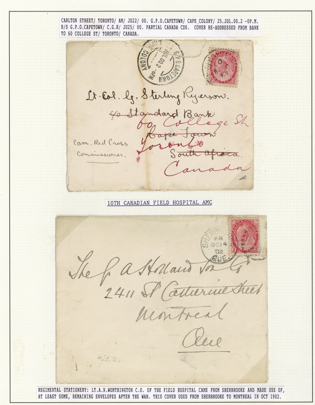 1900 envelope from Canada to South Africa and readdressed back to Canada and 1902 blue OHMS envelope registered from London to Toronto, both addressed to Lt. Col. G.S. Ryerson, Canadian Red Cross Commissioner, 1900 (Jan.) envelope from Toronto to New York with British Red Cross Society Headquarters Toronto red and blue-green emblem at left, and 1902 envelope from Sherbrooke to Montreal with 10th. Canadian Field Hospital imprint on flap