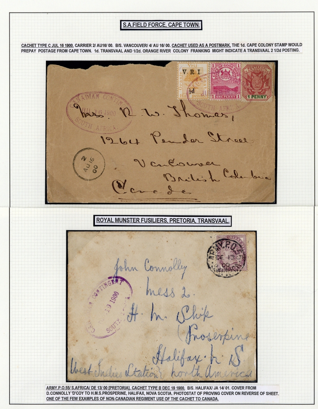 1900 (July-Dec.) covers (5) all showing strikes of the oval-framed "canadian contingent/south africa." datestamp, one with two strikes on Army Post Office Corps printed message regarding delivery of correspondence, three with adhesives cancelled by A.P.O. or F.P.O. c.d.s. and one bearing three different States stamps cancelled by the oval datestamp; mixed condition though an interesting group