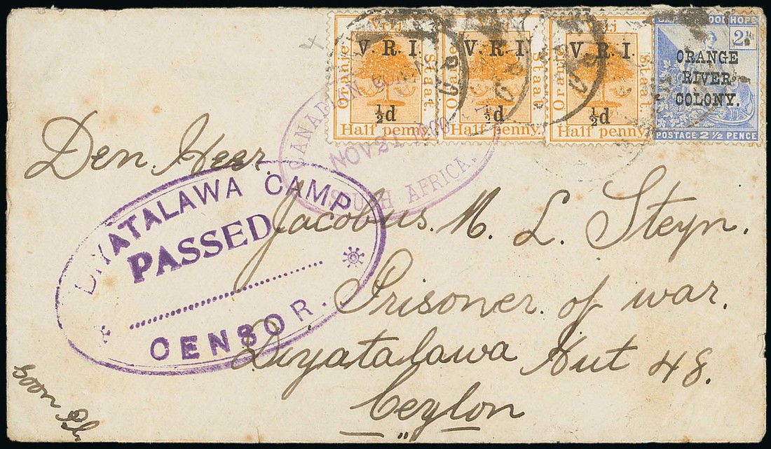 1900 (Nov.) envelope from Rouxville, O.F.S. to a P.O.W. in Diyatalawa Camp, Ceylon, franked at 4d. and showing a good strike of the oval-framed "canadian contingent/south africa." datestamp (21.11) tying the adhesives, and superb Camp censor cachet; a most unusual usage of the Contingent cachet on non-Canadian, non-Contingent mail. Photo