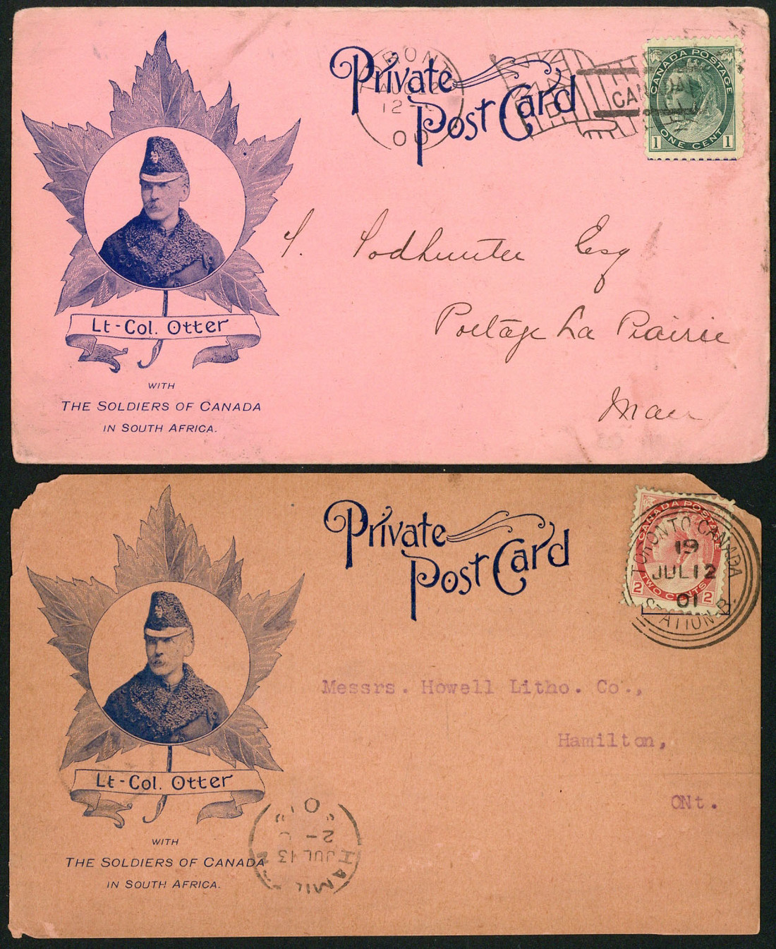 Lt. Col. Otter (2), one on pink stock (advert for Winefred novel on reverse) from Toronto (22.8.00) to Portage La Prairie, the second on red-brown stock (damaged corners) from Toronto (12.7.01) to Hamilton