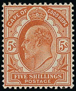 1902-04 5/- brown-orange, unmounted mint, fine. S.G. 78 £160. SACC R5,200 for unmounted. Photo