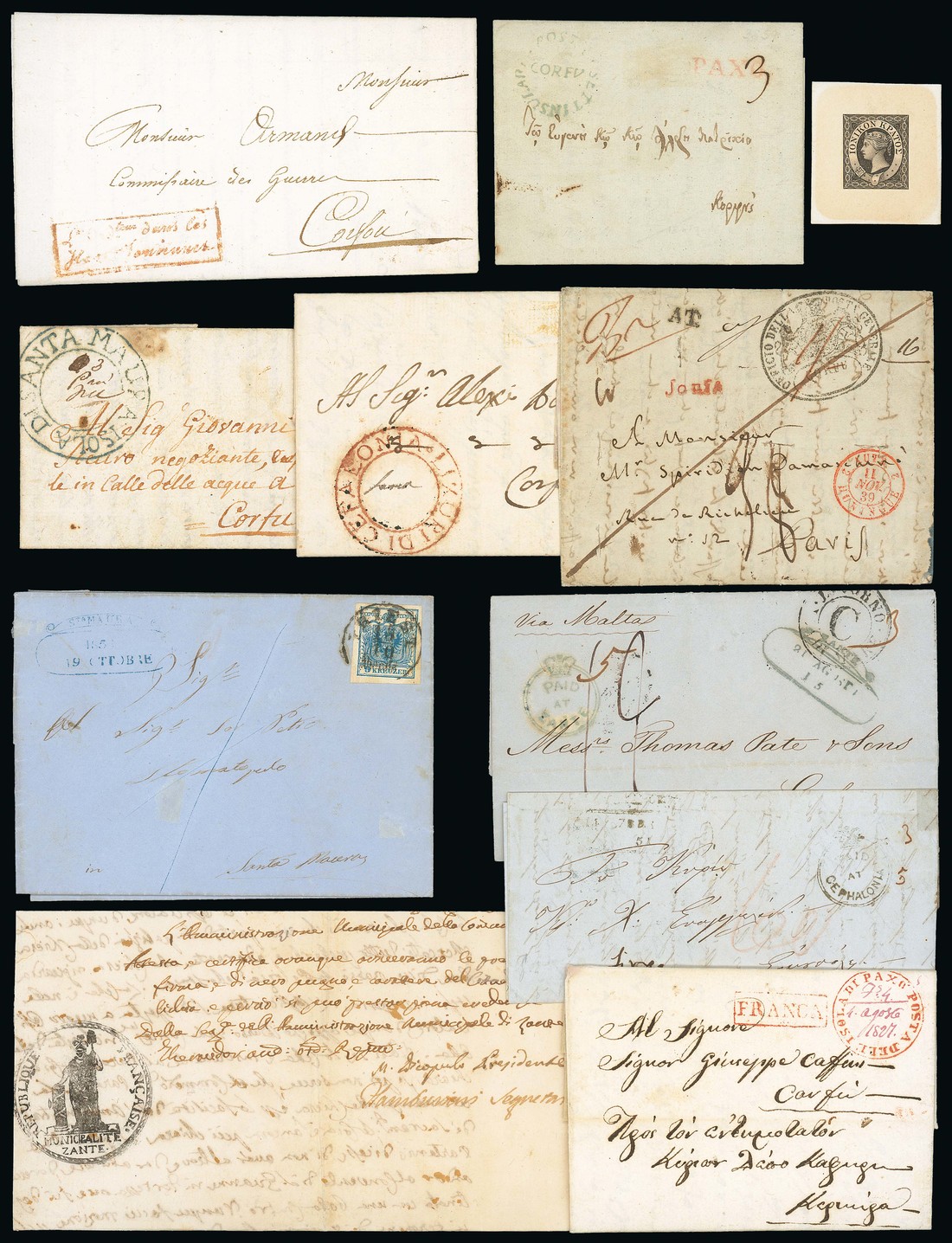 1661-1964 the collection housed in three large binders contained in a carton. 236 covers or cards and 155 stamps. including Venetian Administration with 1661 and 1715 entires from Corfu to Venice, without postal markings, French Administration with 1797 document with "republique française/municipalite/zante" cachet, Septinsular Republic with 1895 entire from Venice with "posta/corfu/settinsulare" handstamp, French Empire Administration with 1812 entire to Corfu with red framed "L'Ordonnateur les/Iles Ioniennes" cachet, 1812 entire with blue "posta/corfu/settinsulare" and red "paxo", British Military Occupation with 1814 entire with "isole/ionie" and 1815 entire with "isola di santa maura", British Protectorate with a wide range of entires and markings with 1822 entire with "lixuri di cefalonia" with manuscript franca, 1818 entire with "isola di zante", 1823 entire with "isola di cefalonia", 1827 and 1828 entires with "posta kalamou", 1833 entire with "isola di cerigo", scrolls of Cefalonia, Cerigo, Corfu, Itaca, Paxo, Sta. Maura, Zante, disinfected, "posta pagata", Crowned Circles with "paid/at/cephalonia", "paid/at/corfu", "paid/at/zante", 1859 stamps with Perkins, Bacon Die Proof in black, the three values in unused blocks of four, (2d.) pencancelled, incoming mail, Greek Administration with postal frauds, postage due and combination frankings, World War I with Serbian Post Offices in Corfu, "postes serbes", Italian Post Offices with 1923 "Corfu Incident" covers, Air Mails,World War II with Italian Occupation of Cephalonia and Ithaca with 1941 Charity 50L. horizontal and vertical pairs, Corfu and Paxos, German Occupation of Zante 1943 red handstamp 10c. block of four, 1953 Earthquake, etc., informatively written up and chiefly good to fine. A valuable lot and the basis for an award winning collection. Photo