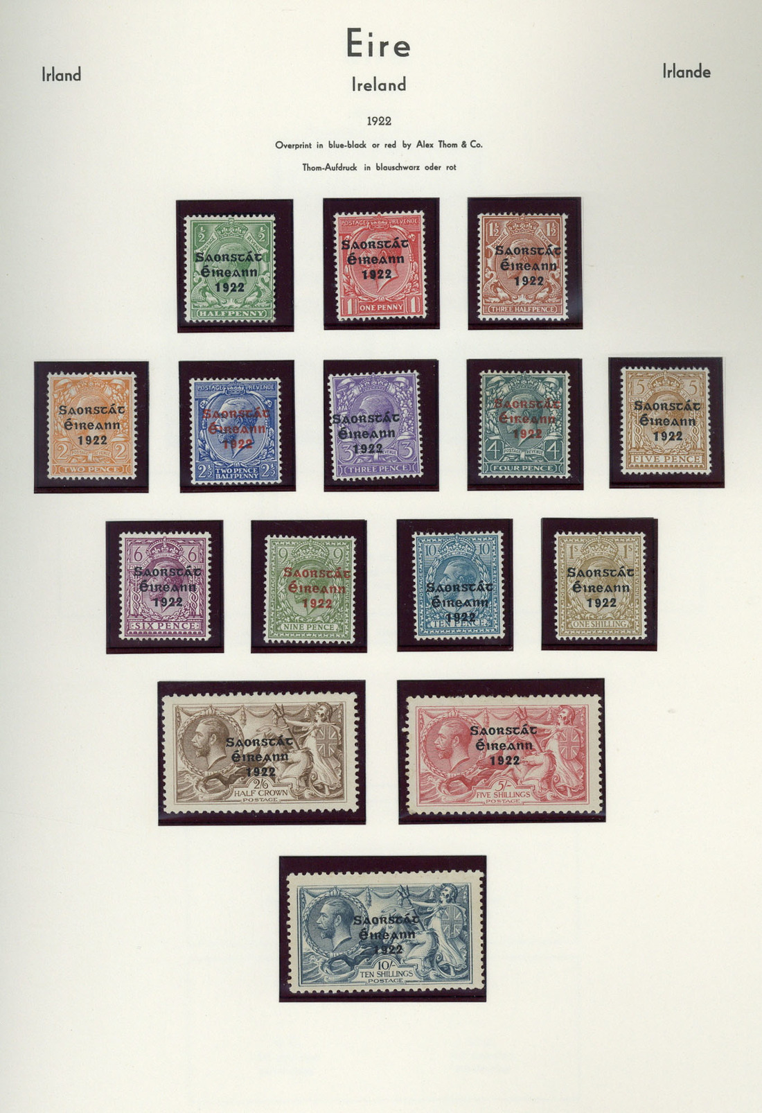 1922-2008 predominantly mint collection housed in three printed albums contained in a carton, including 1922 Dollard 2/6d. to 10/- (gum stained), 1922-23 2/6d. to 10/-, 1925 narrow date 2/6d. to 10/-, 1940-68 1d. coils, a fine and practically complete mint range from 1971 with miniature sheets, values to £5, €10, etc., chiefly fine