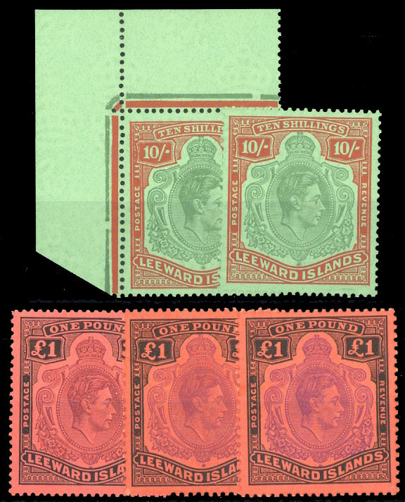 1938-51 10/-deep green and deep vermilion on green ordinary paper (2 one from the upper left corner of the sheet), £1 purple and black on carmine, brown-purple and black on salmon and violet and black on scarlet shades, fine unmounted mint. S.G. 113c, 114a, 114b, 114c, £410