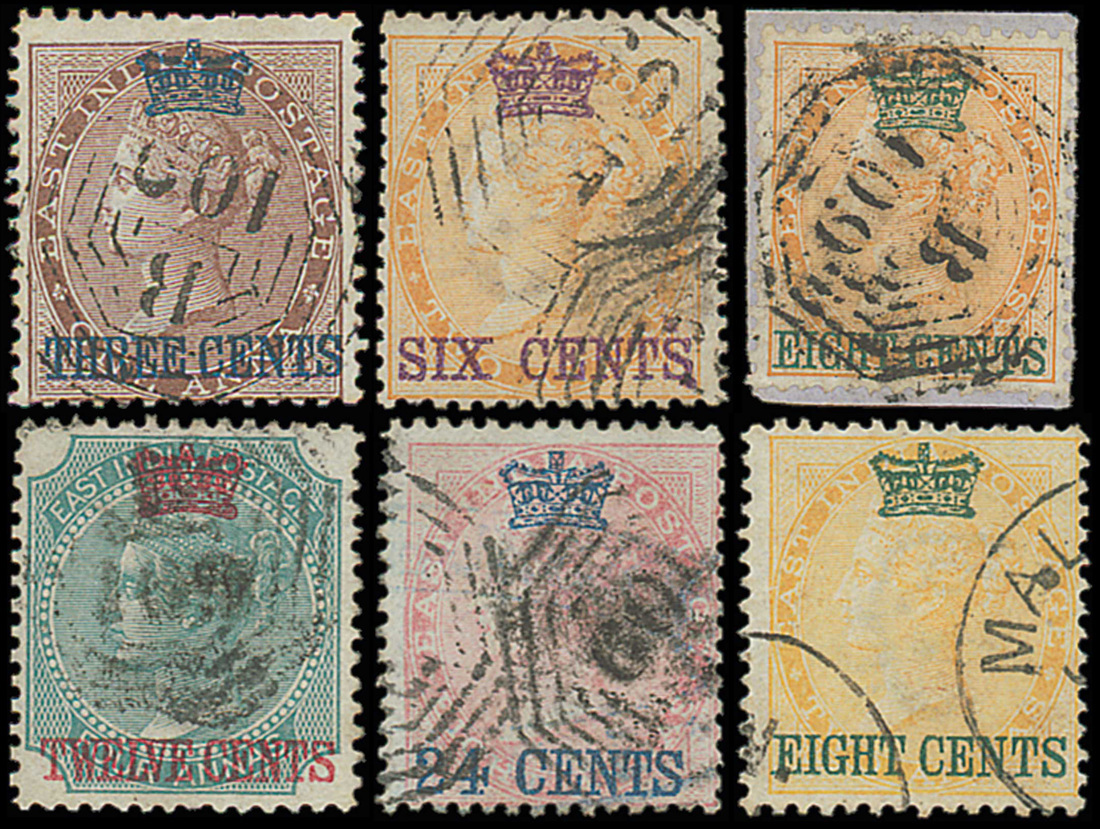 1½c. on ½a., 2c. on 1a., 3c. on 1a. (ex Charles Taylor), 6c. on 2a., 8c. on 2a., 12c. on 4a. and 24c. on 8a. (slightly faded), each cancelled "B/109"; also 8c. on 2a. (slightly faded) cancelled by part Malacca c.d.s.; condition generally fine. A rare group. Cat. £1149+. Photo