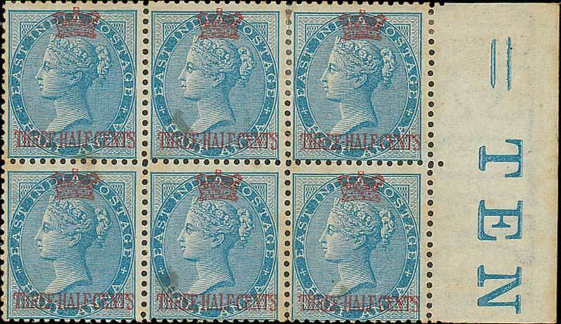1½c. on ½a. blue, a block of six (3x2) with margin at right, unused with part original gum; some hinge remainders, three with small grease spots and one with crease. A scarce multiple. S.G. 1, £720+. Photo