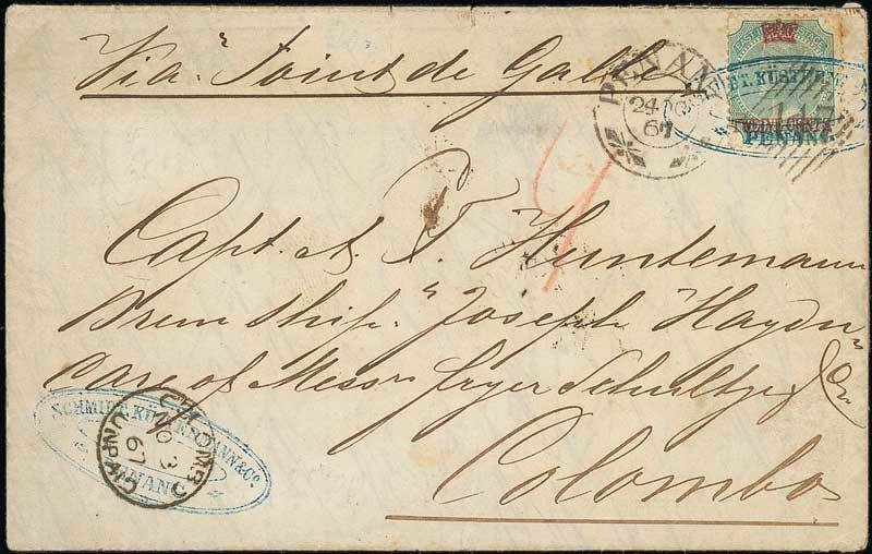 1867 (24 Oct.) entire letter from Penang to Colombo, Ceylon, marked "Via Point de Galle", bearing 12c. on 4a. green tied by blue firm's chop and "147" duplex, showing manuscript "1d" and red crayon "4", "colombo/unpaid" arrival c.d.s. (3.11) with, on reverse, "galle/unpaid" transit c.d.s.; some minor staining around adhesive. A rare franking and one of two covers known to Ceylon, the other is from Singapore. Photo