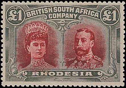 £1 crimson and slate-black, [33] with many head plate flaws, fresh with large part original gum; small inclusion on "h" of "rhodesia". S.GG. 166a, £2,000. Photo
