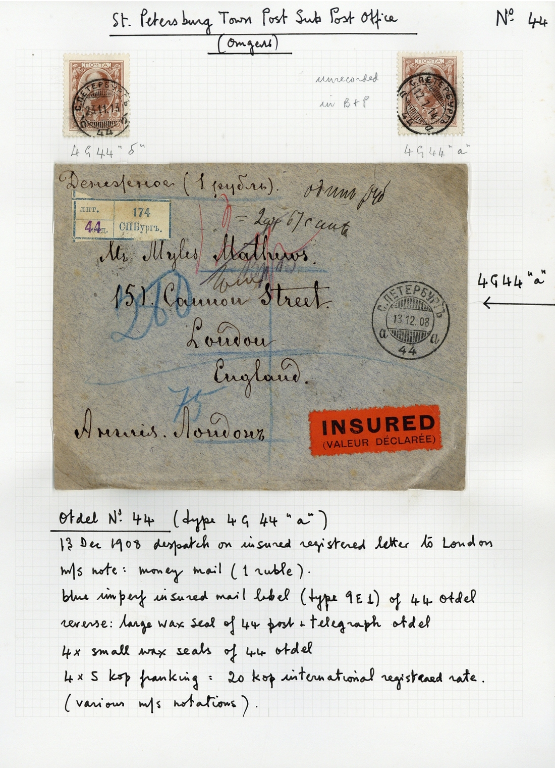 1849-1924 collection of St. Petersburg postal history housed in four albums contained in a carton, almost 450 covers and cards and a quantity of loose stamps, including 1849 entire letter to Riga with red oval d.s., 1850 entire letter to France with boxed St. Petersburg datestamp on reverse, 1854 and 1856 entire letters to France with St. Petersburg lozenge datestamp on reverse, postal stationery, Town Post Numerals, Sub Post Offices, registered, etc., chiefly fine and a most interesting lot. Also Literature with "1703-1914 From the history of the Saint Petersburg Post" by Dobin and Ratner and "St. Petersburg: The Imperial Post - its postmarks and other post markings 1765-1914" and supplement by Baillie and Peel, good condition, owner's notes