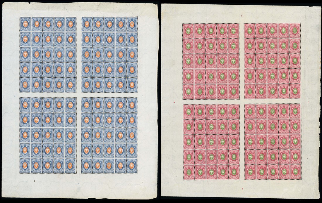 1866-75 perf. 14½ x 15, horizontally laid paper 1k. black and pale yellow, 3k. black and light green, 5k. black and purple, 10k. blue and red-brown, 20k. orange and blue and 30k. green and carmine-rose, the complete set of six values in superb, unmounted mint sheets of 100 (four panes of twenty-five each), fresh, vivid colours, fine and a magnificent set. Only one other set of sheets believed to exist. S.G. 18-23. Photo