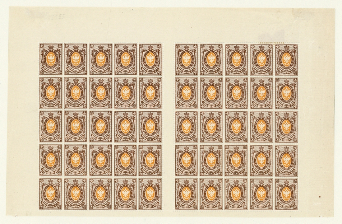 1883-88 Posthorns without thunderbolts 1k., 2k. (2), 3k., 5k., 7k., 14k., 35k. and 70k. with additional 2k. myrtle-green shade, each in a mint block of fifty (two panes of twenty-five), fresh colours, hinged in the margins and two 70k., otherwise unmounted and superb. S.G. 38A-46A