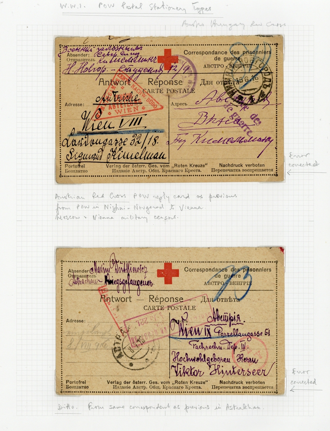 1915-17 Prisoner of War mail collection of over 150 covers and cards partly written up in an album, including covers (40) from various camps in Germany to the Moskauer Hilfscomite in Copenhagen, a variety of camps in Russia, a good variety of Censor handstamps, etc., a few unused but chiefly used, mostly good to fine