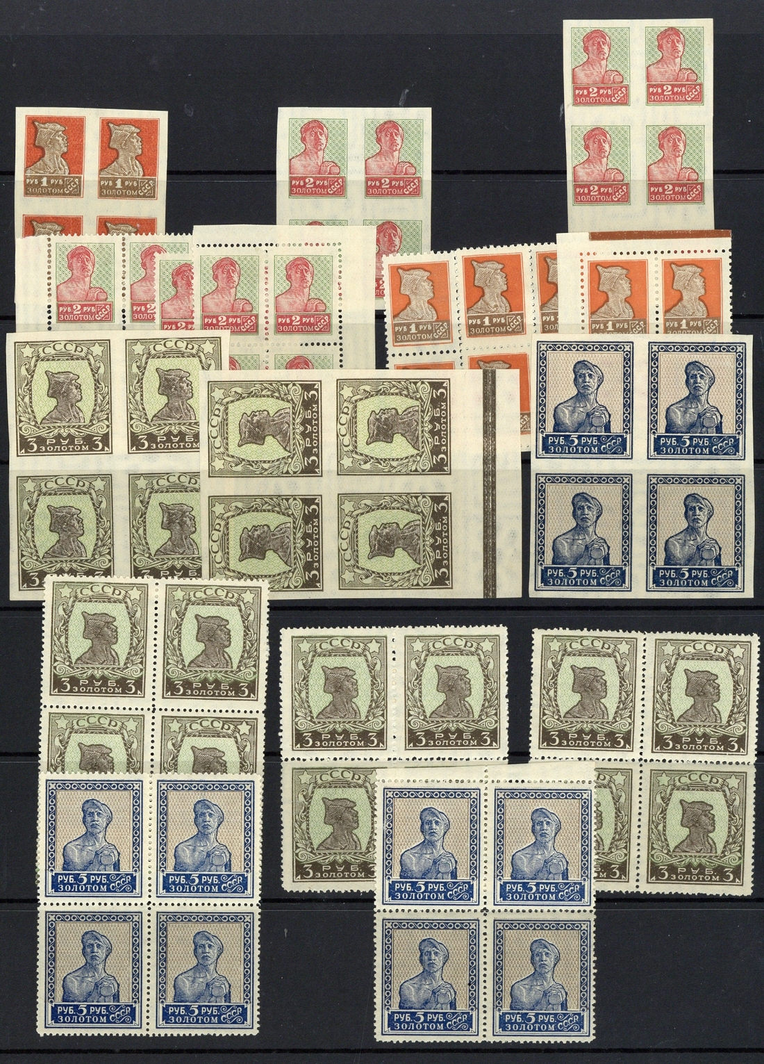 1923-1925 Workers definitives, mint selection (127) on stockpages, including 1923-25 no watermark, lithographed imperforate 1r. block of four, typographed imperforate 2r., 3r. and 5r. blocks of four, perf. 14 x 14½ 1r. and 2r. blocks of four, perf. 13½ 3r. block of four, perf. 10 5r. block of four, 1927 Watermarked perf. 12 18k., 40k., 50k. (2), 1r. (3) blocks of four, imperforate 1r., 2r. (2), 3r. (2) and 5r. blocks of four, perf. 14 x 14½ 2r. (3) blocks of four, perf. 13½ 3r. (3), 5r. (2) blocks of four, etc., chiefly unmounted mint and fine