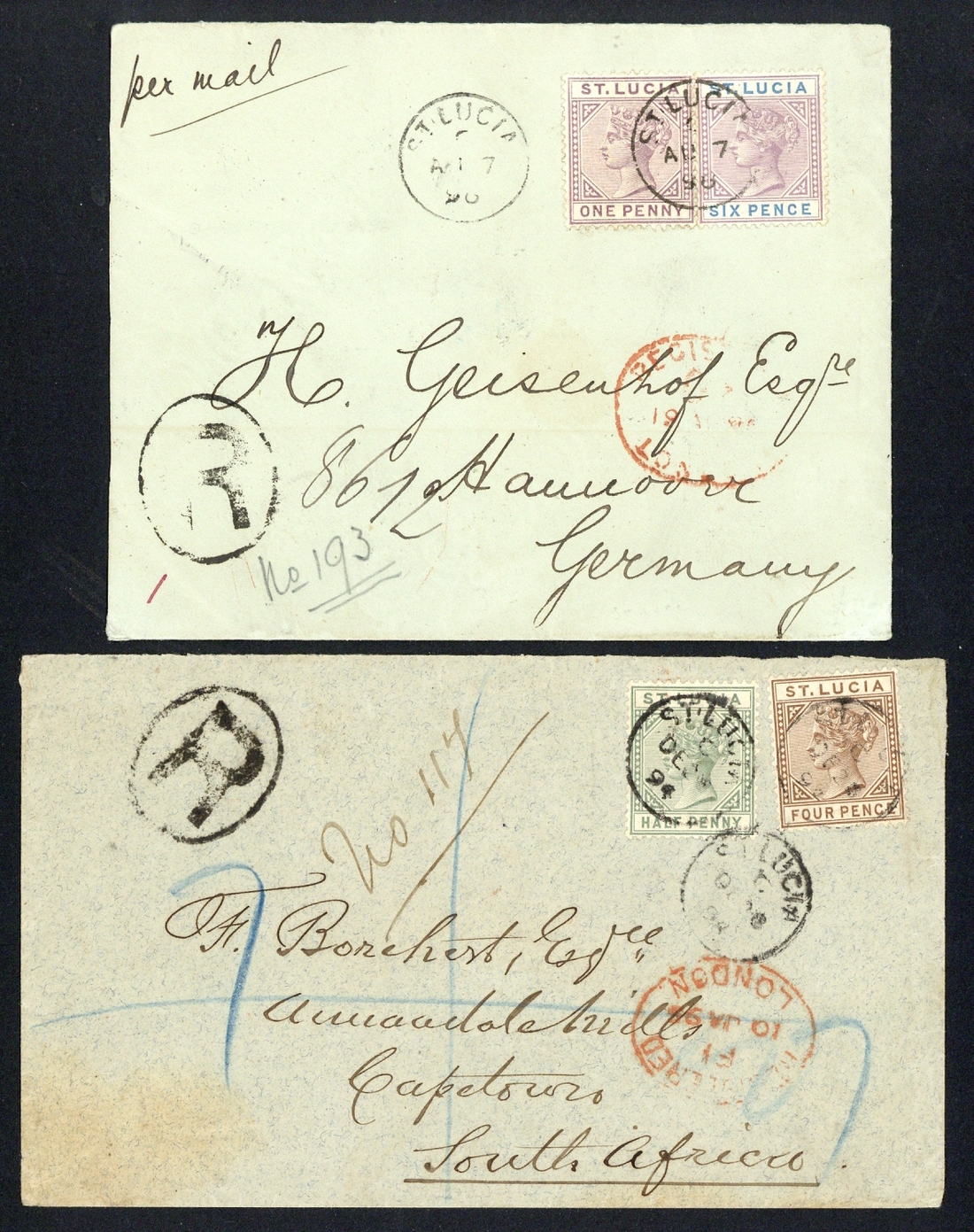 1894 (28 Dec.) envelope registered to Cape Town franked 1891-98 ½d., 4d., red London oval d.s. (10.1) on front, oval Cape Town (31.1) and part Gardens T.O. (1.2) in reverse; also 1896 envelope registered to Germany franked 1d., 6d., good to fine