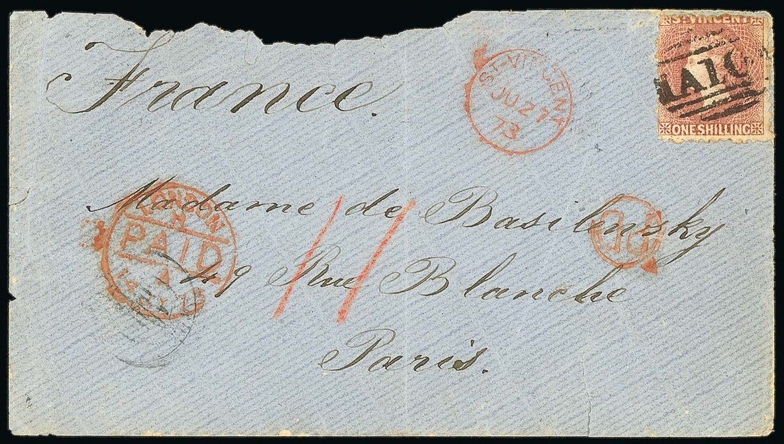 1873 (27 June) envelope to Paris, bearing 1872 1/- deep rose-red with central "A10" obliterator, showing red crayon "11", circular-framed "pd", St. Vincent and London Paid (14.7) datestamps, all in red, and faint Calais entry datestamp; the envelope with part of top torn away through opening and tear at foot. S.G. 17.
