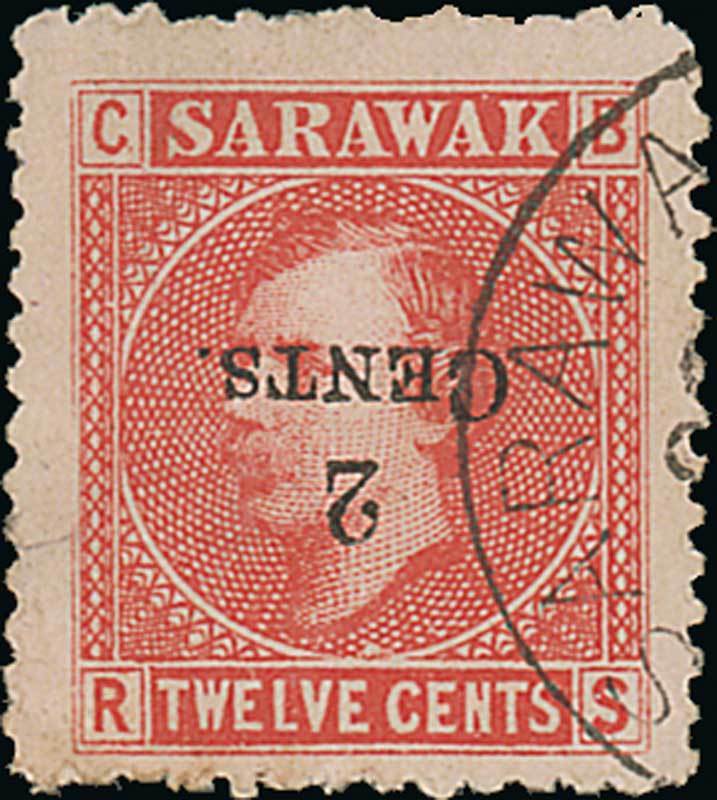 1899 (June-Nov.) 2c. on 12c. red on pale rose, variety surcharge inverted, fine used. Very scarce. B.P.A. Certificate (1995). S.G. 33a, £1400. Photo