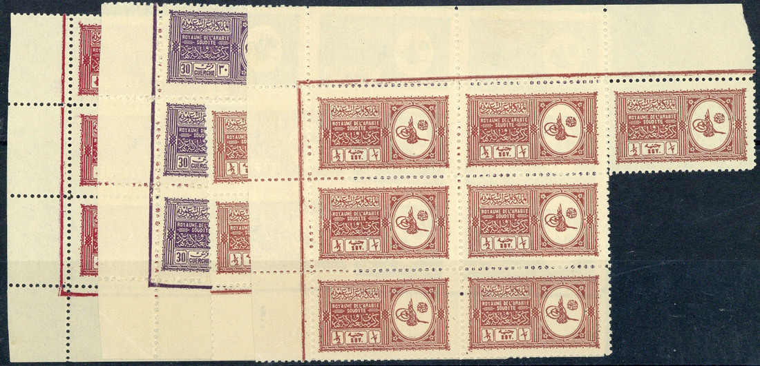1934 Proclamation perf. 11½ ¼s., 30g. and ½s., nine of each, mostly in blocks, unmounted mint, some coloured marks on reverse and two ½s. thinned; rare. S.G. 324-326, £9,675