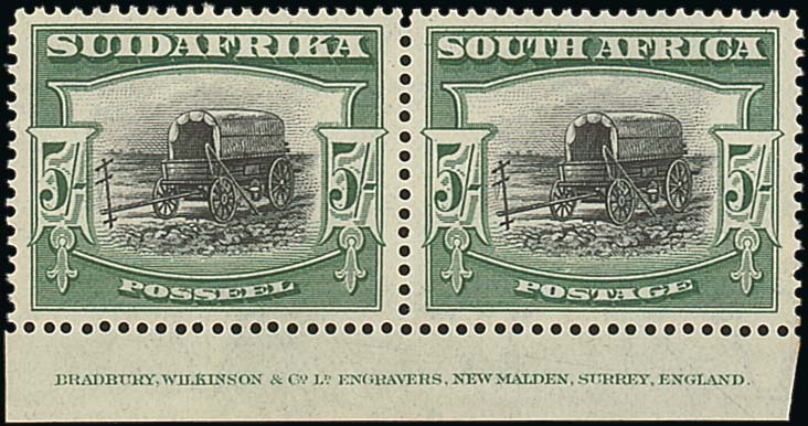 5/- black and green, perf. 14 x 13½ (up), a bi-lingual pair with imprint, unmounted mint, small fox mark at left, fine and scarce. S.G. 38a, SACC R54,000. Photo