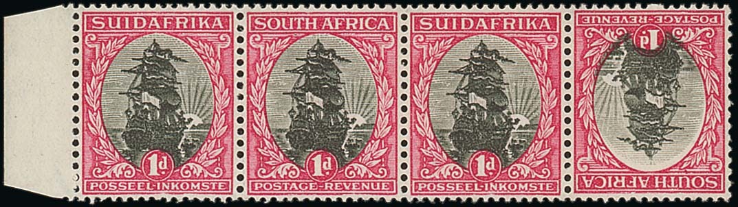 1930-44 1d. black and carmine tête-bêche pair contained in a horizontal strip of four, fine unmounted mint. Rare. S.G. 43a, £1,400. Photo