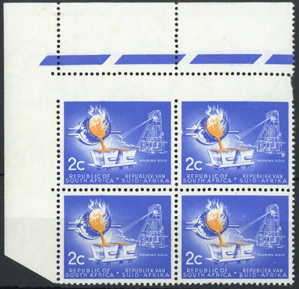 1964-72 "Pouring Gold" 2c. ultramarine and yellow, block of four from the top of the sheet, variety imperforate at top, mint, some wrinkles and small tone spots. Rare. S.G. A241var., SACC R15,000