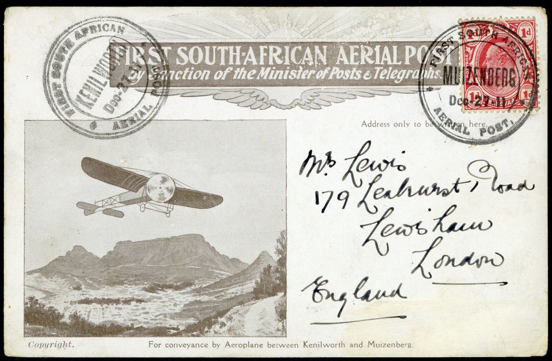 1911 (27 Dec.) First South African Aerial Post, souvenir card to London, franked Transvaal 1d. with Muizenberg cancellation and Kenilworth d.s. (27.12) alongside; a trifle soiled and minor corner bends
