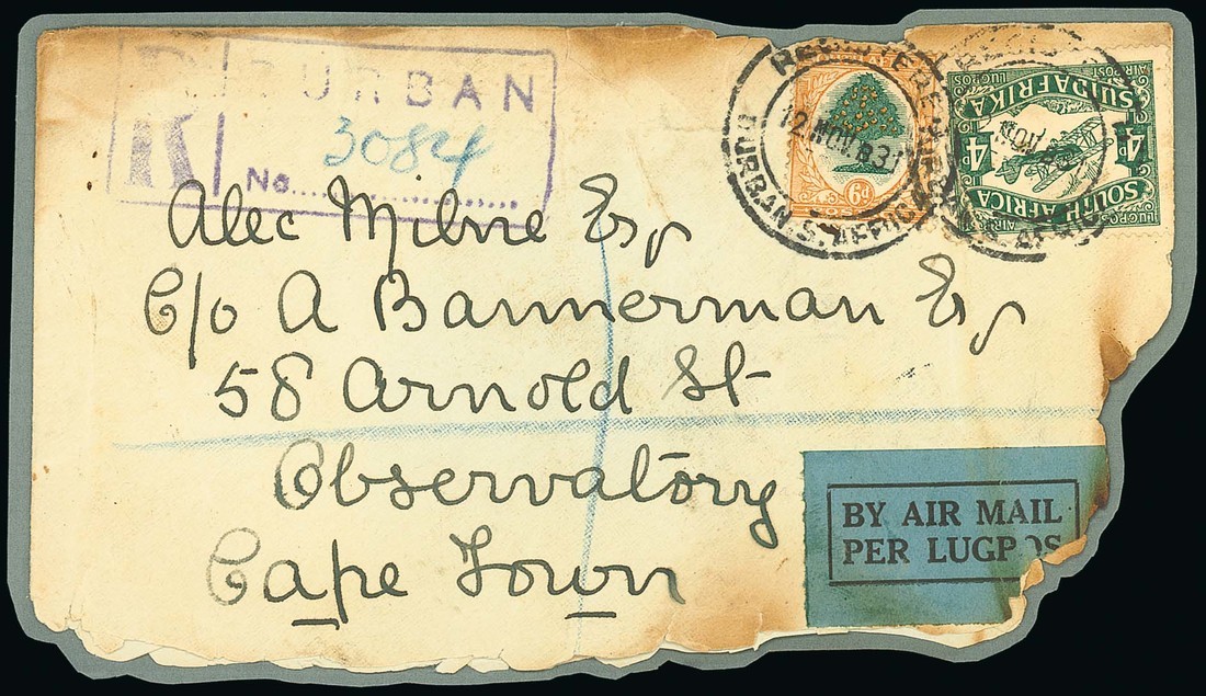 1931 (13 Nov.) attempted Port Elizabeth to Cape Town flight by Captain W.F. Davenport, crashed at Sir Lowry's Pass after being caught in a gale: charred envelope registered to Cape Town, franked 6d. and Air 4d. with Durban cancellations (12.11), complete with Post Office explanatory slip. Extremely rare. Davenport, his two passengers and practically all the mail were incinerated. Photo