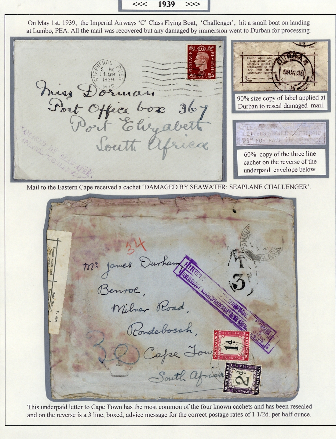 1939 (1 May) Imperial Airways "Challenger", hit a small boat on landing at Lumbo: envelope from Shepherds Bush to Port Elizabeth, franked 1½d., violet "damaged by seawater/airplane challenger" cachet, also envelope from Glasgow to Cape Town, stamps floated off, with violet bilingual "flying boat correspondence damaged by seawater" cachet, taxed by 1d. and 2d. Postage Dues and with found open and officially sealed label