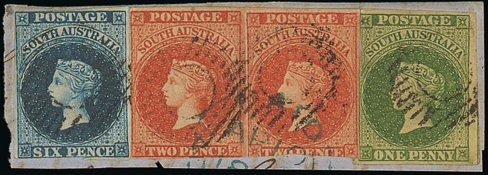 1855 Adelaide 1d. deep yellow-green with 2d. red horizontal pair and in combination with 1855 6d. deep blue, all with good to large margins in places and cancelled with void obliterator on piece showing part datestamp in blue, fine. Rare and colourful. Photo