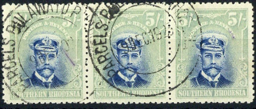1924-29 5/- blue and blue-green, used horizontal strip of three, odd imperfection, scarce. S.G. 14