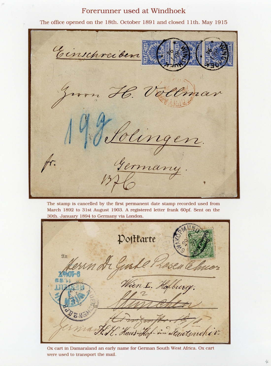 1894 (30 Jan.) envelope registered to Silingen bearing 1889-1900 20pf. blue vertical strip of three, with Windhoek cancellations, red oval London transit on the front and arrival d.s. on reverse; minor perimeter faults. Also 1899 p.p.c. (Ox cart) from Swakopmund to Munich, redirected to Vienna (stained)